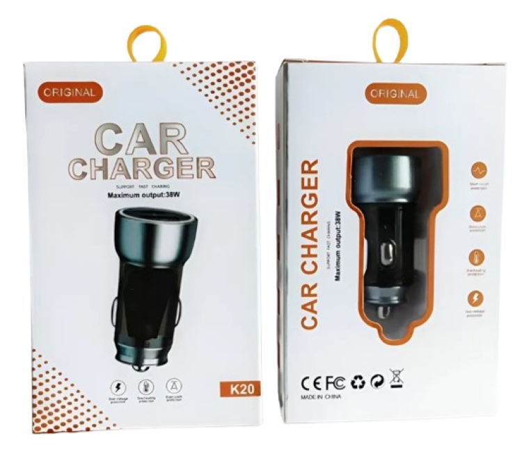 🚗⚡ Cargador de auto modelo K20 con puertos USB y Type-C y potencia de hasta 38W. Ideal para cargar smartphones y dispositivos compatibles con carga rápida mientras conduces. 🔌📱