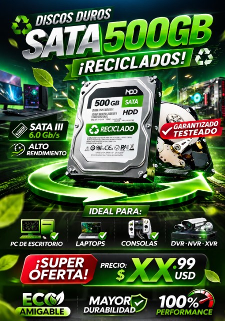 Disco duro interno de 500GB reacondicionado/reciclado, ideal para instalación en equipos DVR de cámaras de seguridad.
