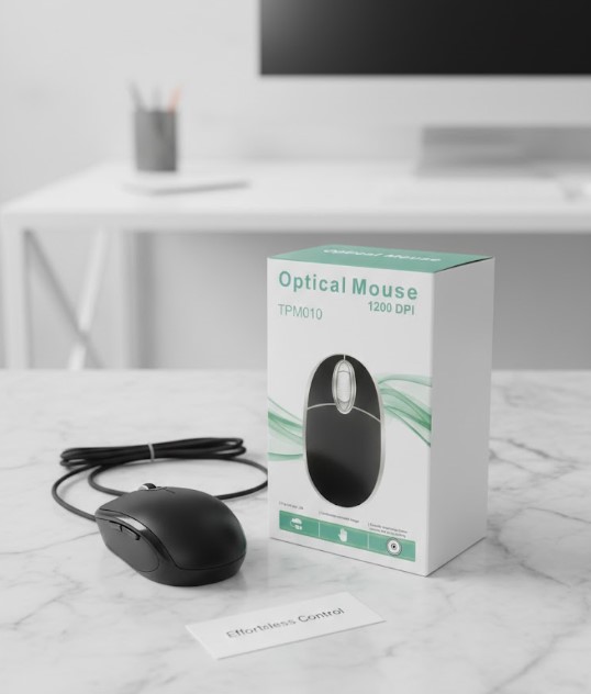 Mouse óptico alámbrico USB TPM010, ideal para uso diario en oficina, estudio o hogar. Diseño ergonómico, conexión Plug & Play y desplazamiento preciso.